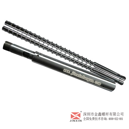 塑机射出螺杆简介:固态塑料原料自进料漏斗进入螺杆螺槽(screw channel)内,由于螺杆高速旋转而与熔胶筒(barrel)产生剪切效应作用,使塑料原料混炼并沿着螺杆螺槽输送,使固态塑料原料受到熔胶筒外侧之电热片加热与螺杆产生的剪切热作用下,使熔胶筒内部升温而熔成熔体态。